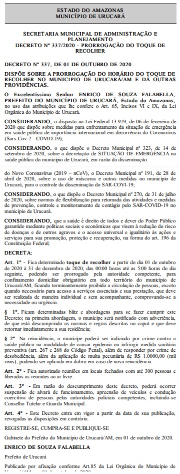 MANAUS – A Prefeitura de Urucará (a 260 quilômetros de Manaus) voltou a decretar toque de recolher no município por conta da pandemia da Covid-19, mas autorizou que reuniões em locais fechados ocorram com até 300 pessoas. No entanto, de acordo com especialistas, eventos com aglomeração são propícios para a disseminação do vírus.