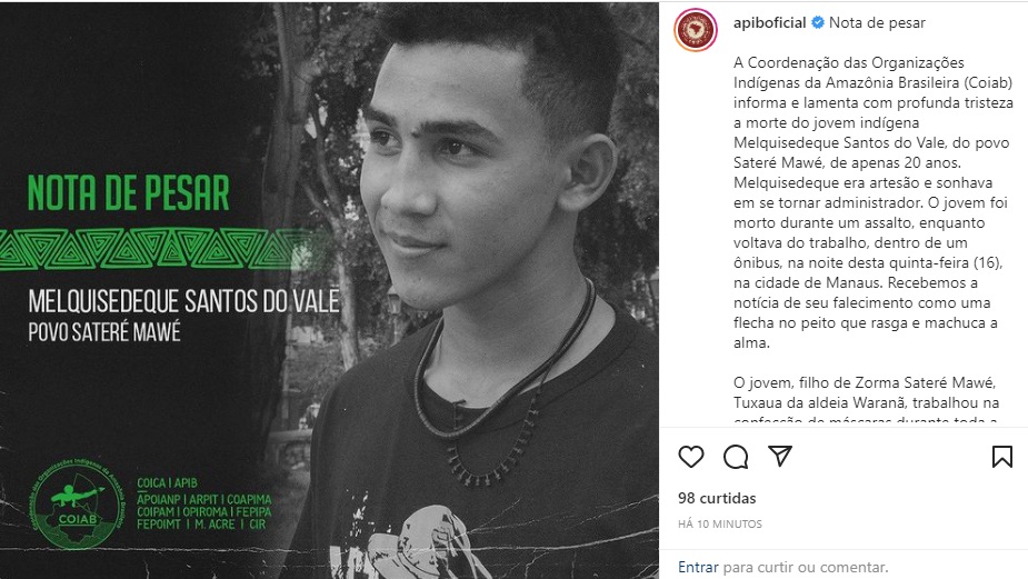 Na publicação, a articulação manifestou, ainda, solidariedade à mãe de Melquisedeque, a avó, a todos os familiares, amigos e todos do povo Sateré-Mawé, assim como a todos os indígenas que sentem neste momento a dor da perda de mais um jovem.