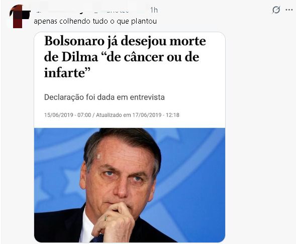 (MANAUS-AM) — Após o diagnóstico de câncer de pele inicial do ex-presidente Jair Bolsonaro (PL), usuários das redes sociais resgataram uma declaração feita por ele em 2015, quando afirmou que desejava que a então presidenta Dilma Rousseff (PT) tivesse um infarto ou morresse de câncer. Na ocasião, Bolsonaro respondia sobre a permanência de Dilma no cargo e disse: “Eu espero que acabe hoje, infartada ou com câncer, de qualquer maneira”.
