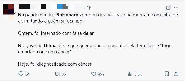 Na rede social X (ex-Twitter), o estado de saúde do ex-presidente se tornou um dos assuntos mais comentados do momento. Usuários chegaram a comparar tanto as declarações durante a pandemia de Covid-19 quanto a fala sobre a ex-presidenta. “Na pandemia, Jair Bolsonaro zombou das pessoas que morriam com falta de ar, imitando alguém sufocando. Ontem, foi internado com falta de ar. No Governo Dilma, disse que queria que o mandato dela terminasse ‘logo, infartada ou com câncer’. Hoje, foi diagnosticado com câncer. “, escreveu um internauta.