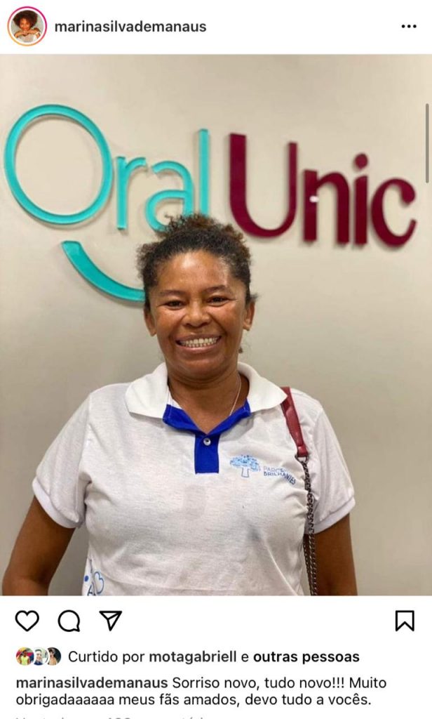 Maria Solange dividiu com os seguidores a realização do sonho e, com um largo sorriso, mostrou o resultado do procedimento estético nos dentes. “Sorriso novo, tudo novo”, destacou na postagem. Marina Silva aproveitou a oportunidade para responder e agradecer o carinho dos fãs.