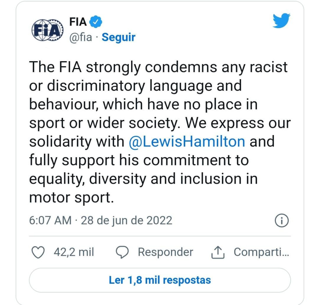 “A Federação condena, veementemente, qualquer linguagem e comportamento racista ou discriminatório que não tem lugar no esporte ou na sociedade em geral. Expressamos nossa solidariedade a Lewis Hamilton e apoiamos totalmente seu compromisso com a igualdade, diversidade e inclusão no esporte a motor.