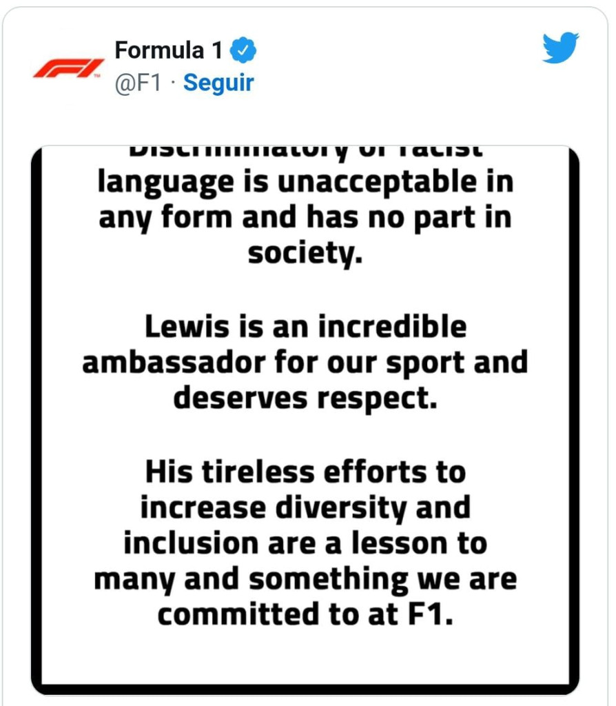 “Linguagem discriminatória ou racista é inaceitável de qualquer forma e não deve fazer parte da sociedade”, repreendeu a Fórmula 1 reforçando que “Lewis é um embaixador incrível para nosso esporte e merece respeito. Seus esforços incansáveis para aumentar a diversidade e a inclusão são ensinamentos para muitos e princípios com os quais a F1 está comprometida”, informou o grupo.