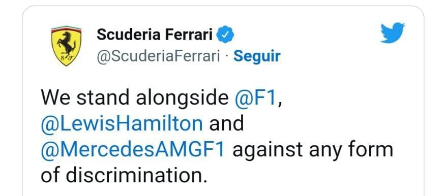 “Estamos ao lado da F1, Lewis Hamilton e Mercedes contra qualquer forma de discriminação” – escreveu a escuderia vice-líder do Campeonato 2022 Ferrari.