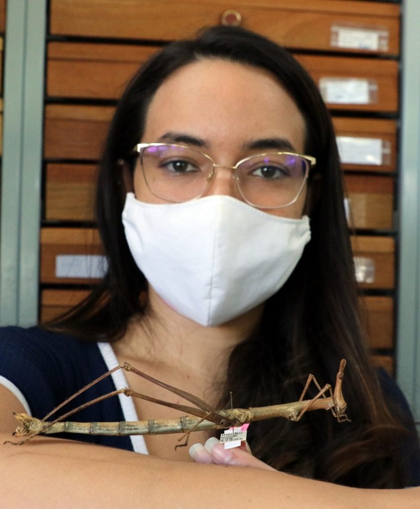 “Os insetos que eu trabalho são erroneamente chamados de bicho-pau. O nome popular dele é Taquarinha. Em Manaus, são conhecidos como falsos bicho-pau, porém, são gafanhotos. Eles não têm asa, medem entre 5 e 18 centímetros e não causam problema nenhum para o meio ambiente ou para agricultura. Em outras regiões do Brasil, por exemplo, eles são bem menores do que na Amazônia. Geralmente, eles são encontrados em fragmentos de floresta, nas cidades, em árvores como ingazeiras, entre outras. Na capital amazonense, são achados facilmente no Museu da Amazônia (Musa)”, afirma a pesquisadora.
