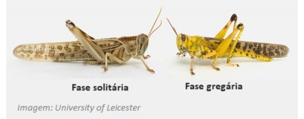 Questionada sobre a diferença da fase de reprodução, Larissa explica. “A fêmea colocou 200 ovos, por exemplo. Todos eclodem e quando o clima favorece para que todos esses gafanhotos nasçam um próximo do outro, acontece uma reação, que ao invés deles virarem adultos solitários e tenham uma vida independente, com uma coloração e tamanho totalmente diferentes, eles viram adultos gregários. Neste caso, além de coloração e tamanho, eles também liberam um hormônio que acaba atraindo mais gafanhoto até formar essas nuvens”, esclarece a pesquisadora.