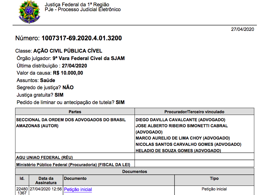 Segundo a OAB-AM, a ação foi ajuizada na Justiça Federal sob o nº 1007317-69.2020.4.01.3200 e requer ainda o envio prioritário de Equipamentos de Proteção Individual (EPI) às unidades de saúde do Amazonas, devido a gravidade do cenário pandêmico de Covid-19. Atualmente, o Estado possui 3.928 casos confirmados de Coronavírus.