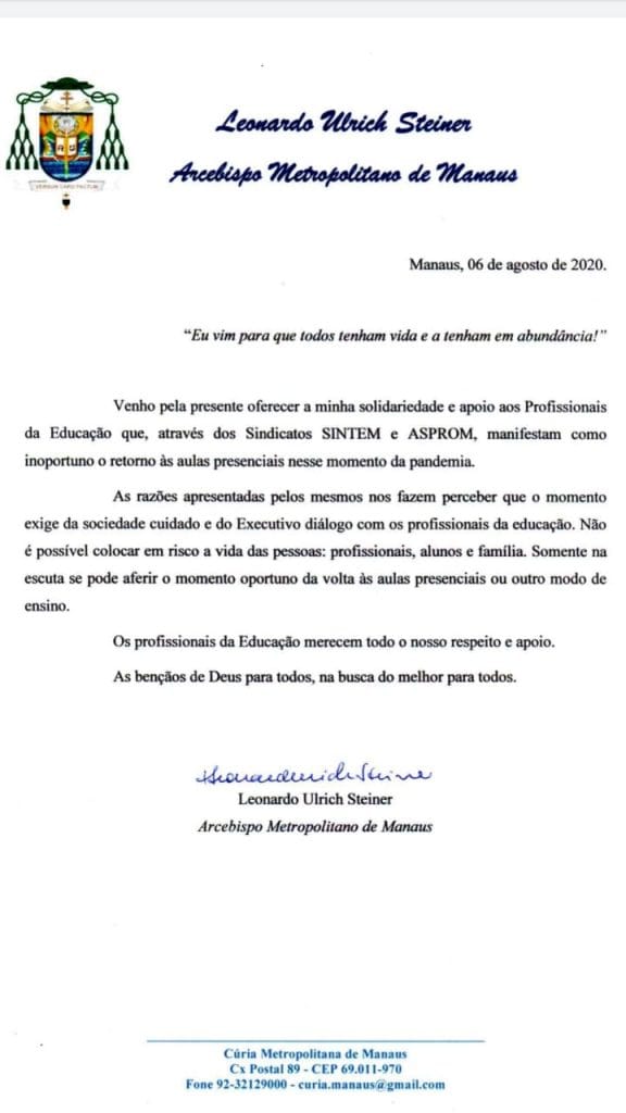 “As razões apresentadas pelos mesmos (Sinteam e Asprom/Sindical) nos fazem perceber que o momento exige da sociedade cuidado e do Executivo diálogo com os profissionais da educação. Não é possível colocar em risco a vida das pessoas: profissionais, alunos e família. Somente na escuta se pode aferir o momento oportuno da volta às aulas presenciais ou outro modo de ensino”, disse o Dom Leonardo Steiner.