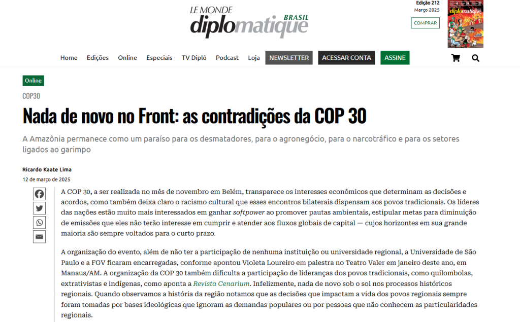 Artigo no Le Mond Diplomatique cita CENARIUM ao criticar COP30