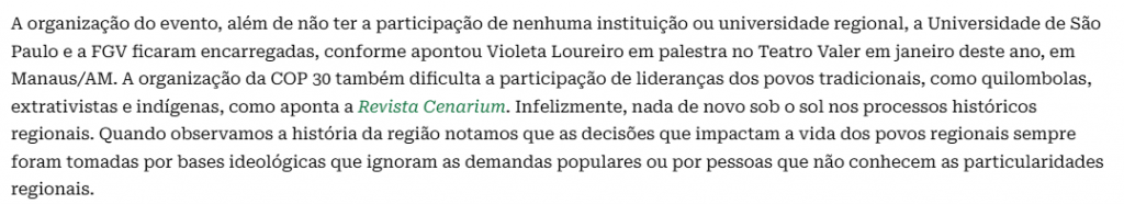 “A organização da COP30 também dificulta a participação de lideranças dos povos tradicionais, como quilombolas, extrativistas e indígenas, como aponta a Revista Cenarium”, destaca o artigo publicado no último dia 12 de março.