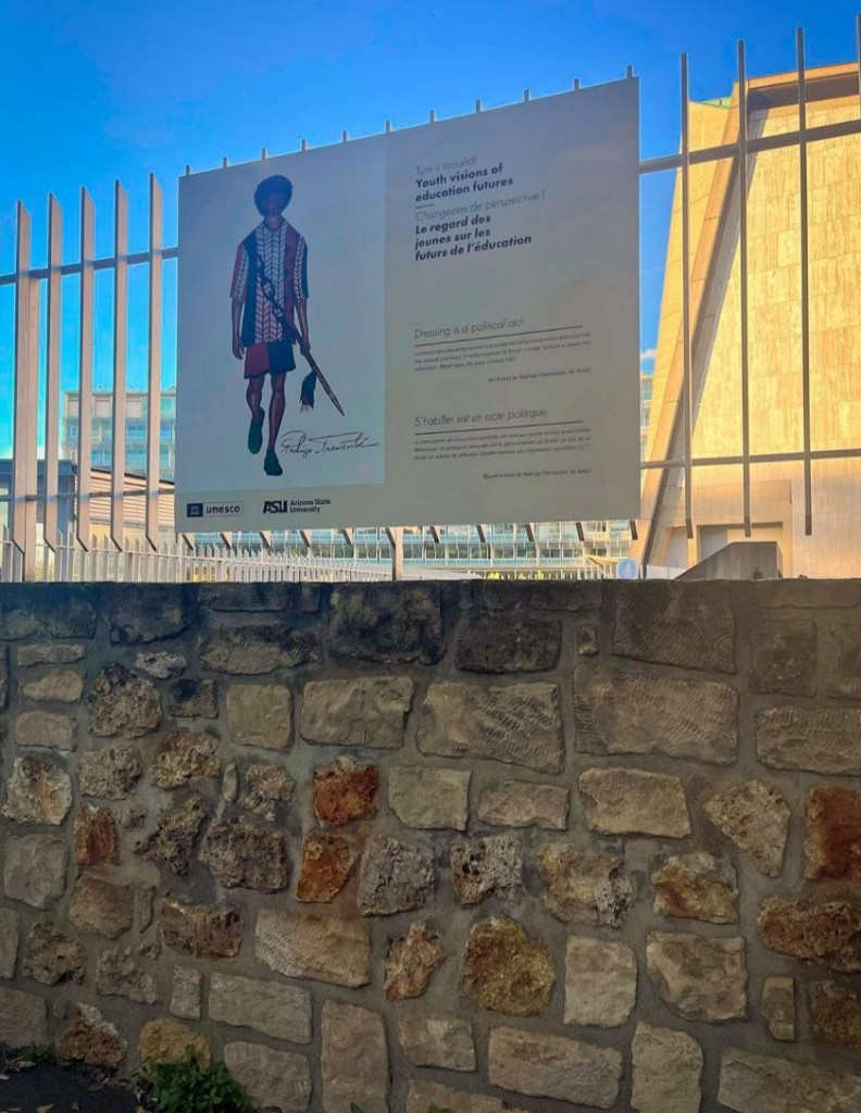 “O tema da exposição trata da educação ambiental como ferramenta transformadora, e como meu trabalho na moda indígena se alinha a essas questões submeti minha arte. Então, fui o único escolhido para representar o Brasil na luta por justiça climática”, explica Tremembé.
