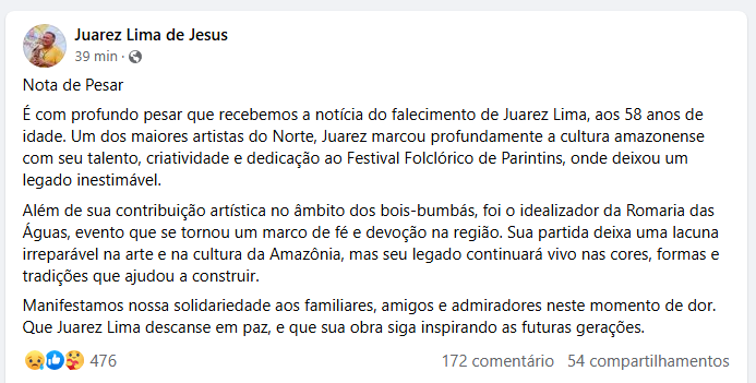 “É com profundo pesar que recebemos a notícia do falecimento de Juarez Lima, aos 58 anos de idade. Um dos maiores artistas do Norte, Juarez marcou profundamente a cultura amazonense com seu talento, criatividade e dedicação ao Festival Folclórico de Parintins, onde deixou um legado inestimável”, disse a família do artista, em nota.
