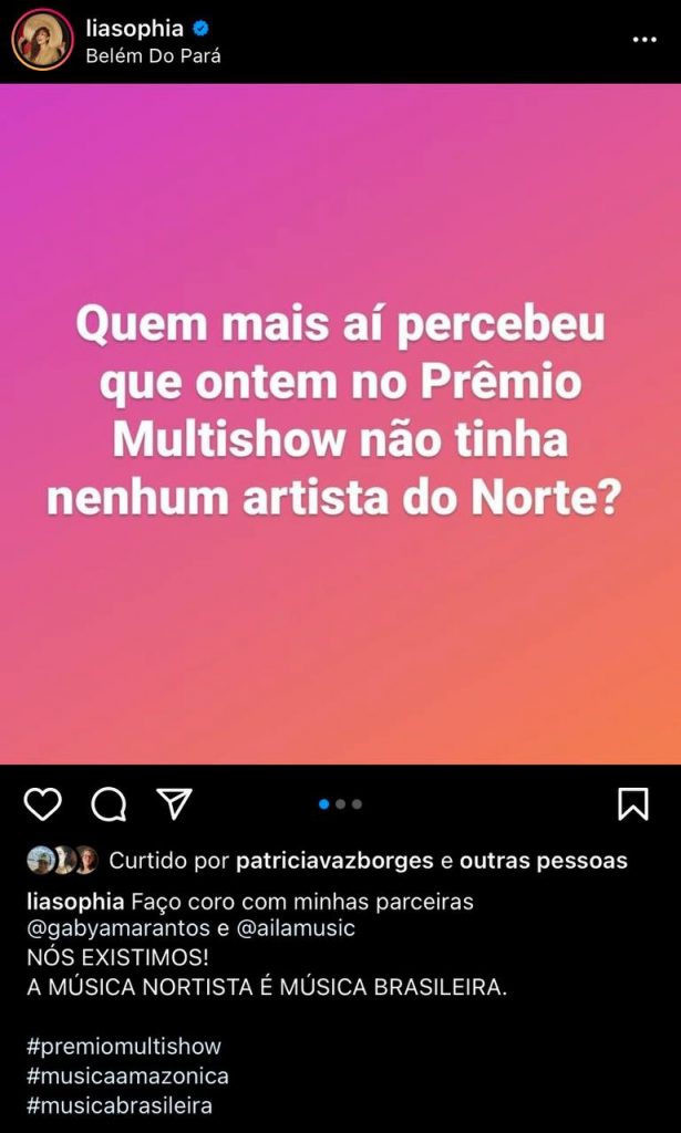 Acompanhando a colega artista do mesmo Estado, Lia Sophia, também cantora paraense, demonstrou a mesma revolta no Instagram – e ambas contaram com o apoio de artistas de vários setores brasileiros.