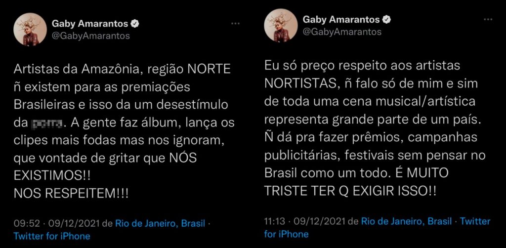 Uma das vozes que mais expressou indignação nas redes sociais foi a da cantora Gaby Amarantos, paraense. No Twitter, em forte desabafo, Gaby disse que “Artistas da Amazônia, da Região Norte, não existem para as premiações brasileiras e isso dá um desestímulo (…)”.
