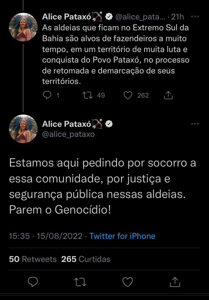 “A violência parte de muitos lados, dos fazendeiros e pistoleiros, muitas vezes milicianos contratados para exterminar a comunidade, uma situação violenta que passa por cima dos Direitos Humanos de todos nós”, explicou Alice Pataxó, no Twitter. “As aldeias que ficam no extremo Sul da Bahia são alvos de fazendeiros há muito tempo, em um território de muita luta e conquista do povo Pataxó, no processo de retomada e demarcação de seus territórios”, continuou.