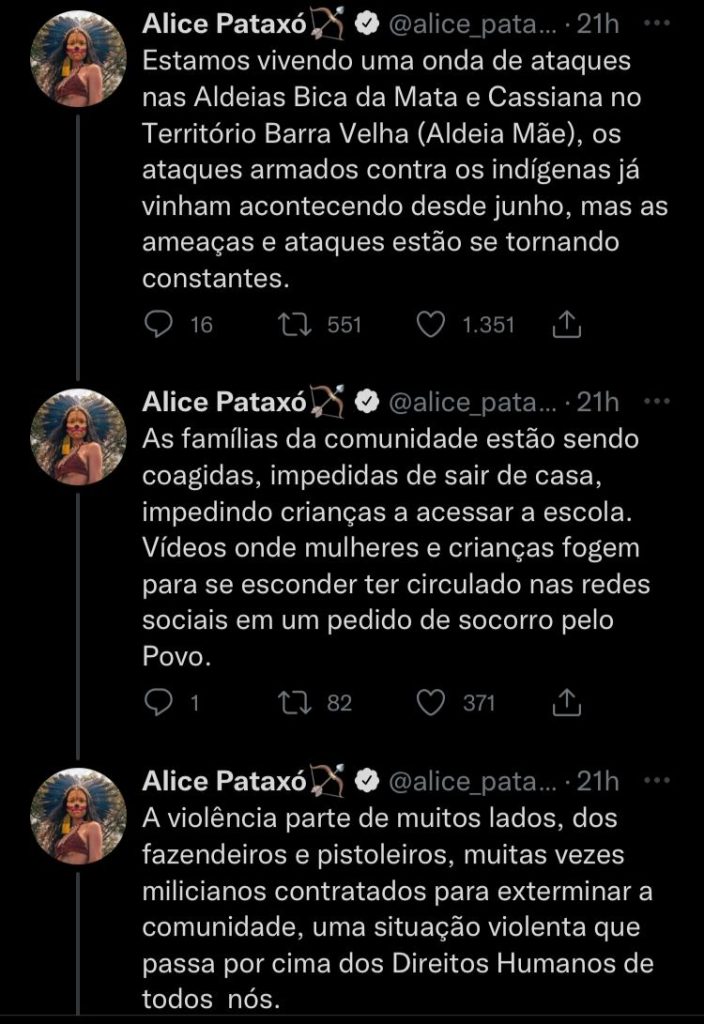 “Estamos vivendo uma onda de ataques nas aldeias Boca da Mata e Cassiana no território indígena Barra Velha (Aldeia Mãe), os ataques armados contra os indígenas já vinham acontecendo desde junho, mas as ameaças e ataques estão se tornando constantes”, começou a indígena, em uma sequência de publicações no Twitter.