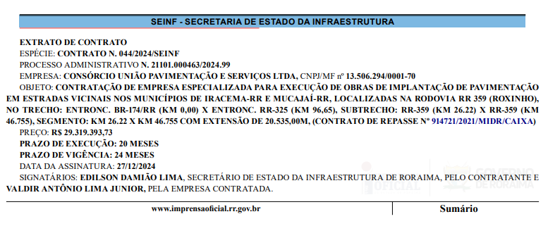 Quem assina o contrato é o vice-governador de Roraima e secretário da infraestrutura, Edilson Damião, assim como o Valdir Antônio Lima Junior, que responde pela empresa contratada.