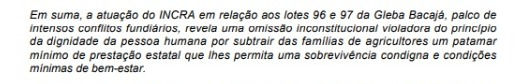 De acordo com o documento, as justificativas dadas pelo Incra foram rejeitadas e a Justiça deu o prazo de 60 dias para cumprimento, sob pena de multa diária de R$ 2 mil.