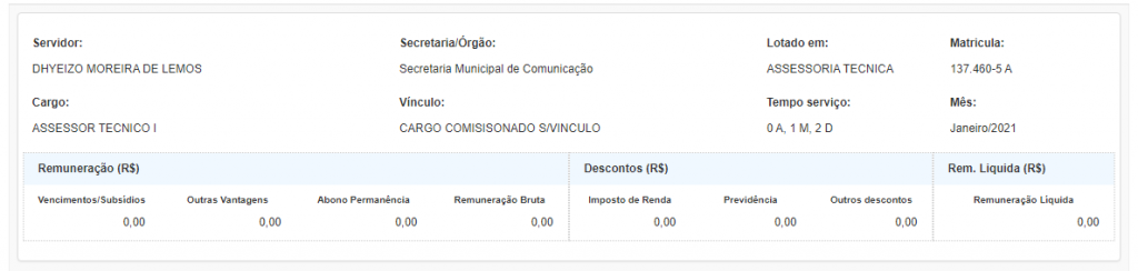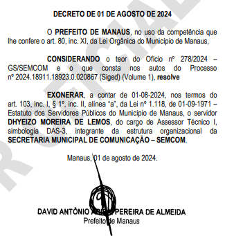 De acordo com consulta feita na manhã desta sexta-feira, 30, no Portal da Transparência da Prefeitura de Manaus, o fotógrafo Dhyeizo Lemos integrava o quadro de servidores da Secretaria Municipal de Comunicação (Semcom) desde janeiro de 2021, mês em que David Almeida assumiu o cargo de prefeito da capital amazonense.
