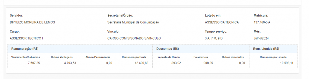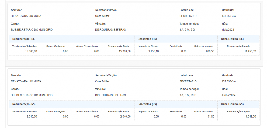 A última remuneração consta, no Portal da Transparência, no valor de R$ 1.948, 20, em junho de 2024. A reportagem questionou a Casa Militar sobre o servidor estar fazendo a segurança do prefeito durante a campanha eleitoral, enquanto continua como funcionário da instituição, e aguarda resposta.