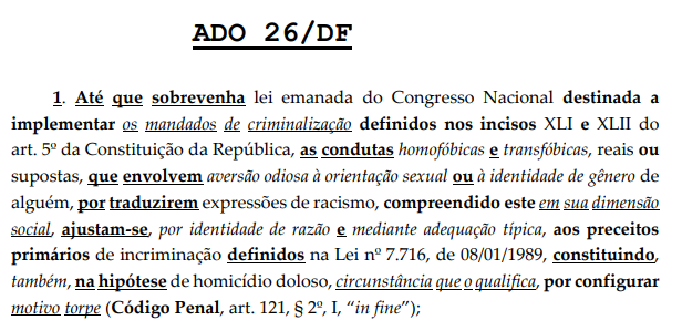 O Supremo Tribunal Federal (STF) criminalizou a homofobia e a transfobia, no mesmo enquadramento da Lei de Racismo (7.716/89). A partir de então, condutas que “envolvem aversão odiosa à orientação sexual ou à identidade de gênero” são consideradas crime, com pena de um a três anos de prisão e multa. Quando o ato tem divulgação ampla, a penalidade pode subir para até cinco anos.