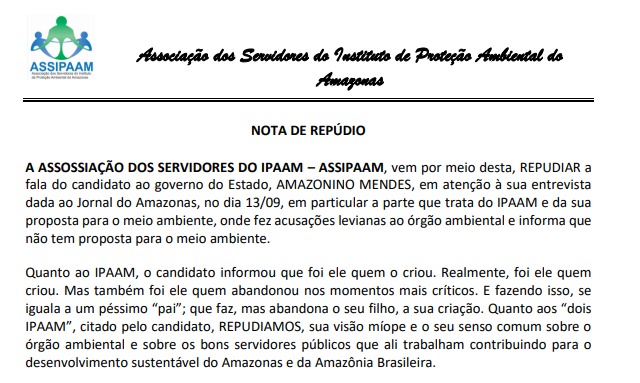 “Quanto ao Ipaam, o candidato informou que foi ele quem criou. Realmente, foi ele quem criou. Mas também foi ele quem abandonou nos momentos mais críticos. E, fazendo isso, se iguala a um péssimo “pai”; que faz, mas abandona o seu filho, a sua criação“, consta um trecho da nota que também destaca a “falta de propostas” voltadas ao meio ambiente.