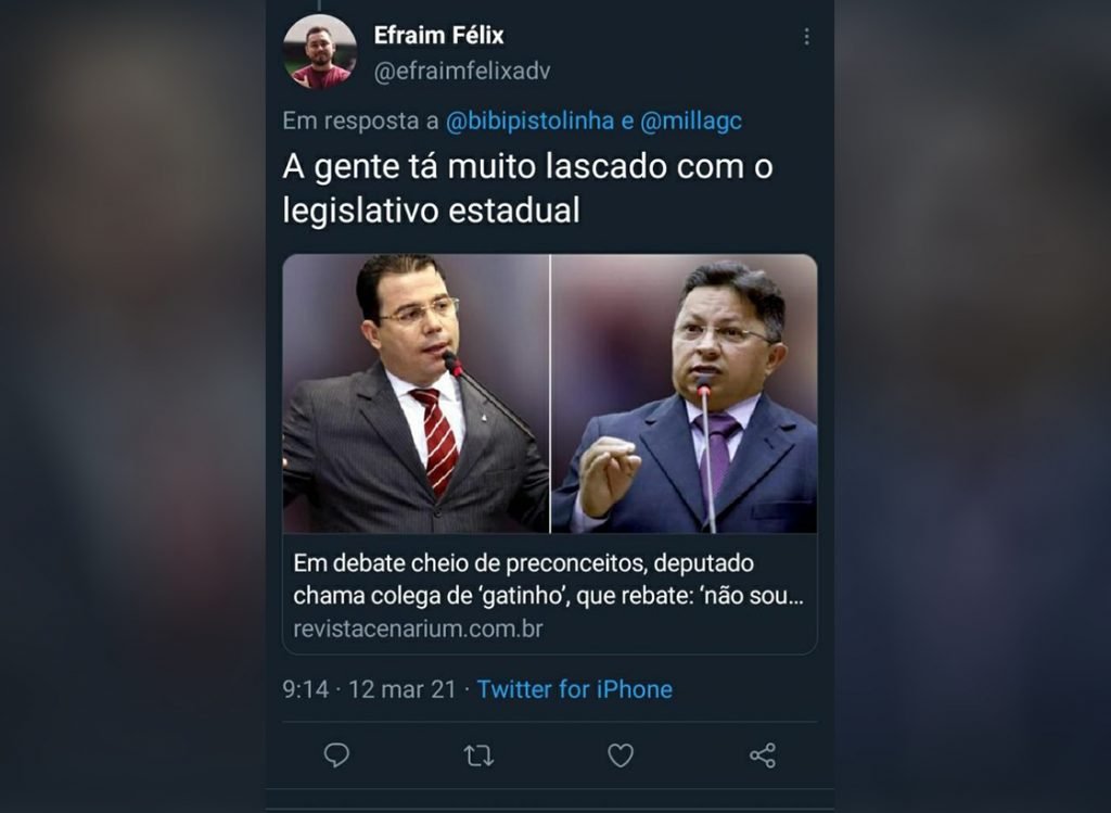 Para o advogado e ativista político, Efraim Félix, o Amazonas não está bem representado. Nas redes sociais, ele fez um breve desabafo sobre os deputados, ao compartilhar a reportagem da REVISTA CENARIUM. “A gente está muito lascado com o legislativo estadual”, lamentou, no Twitter.
