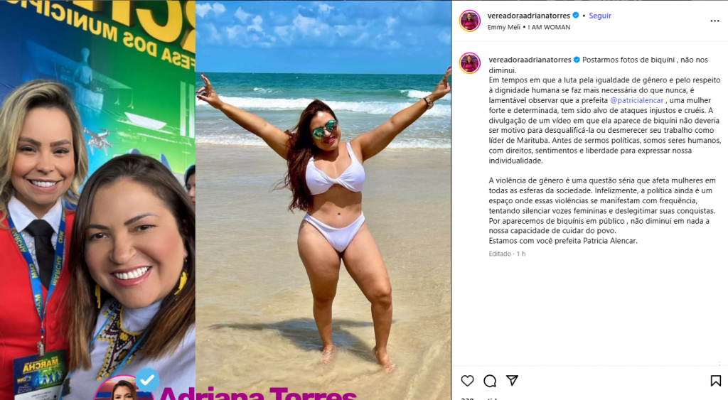 “Postarmos fotos de biquíni, não nos diminui. Em tempos em que a luta pela igualdade de gênero e pelo respeito à dignidade humana se faz mais necessária do que nunca, é lamentável observar que a prefeita, Patrícia Alencar, uma mulher forte e determinada, tem sido alvo de ataques injustos e cruéis”, afirmou a parlamentar. Veja publicação: