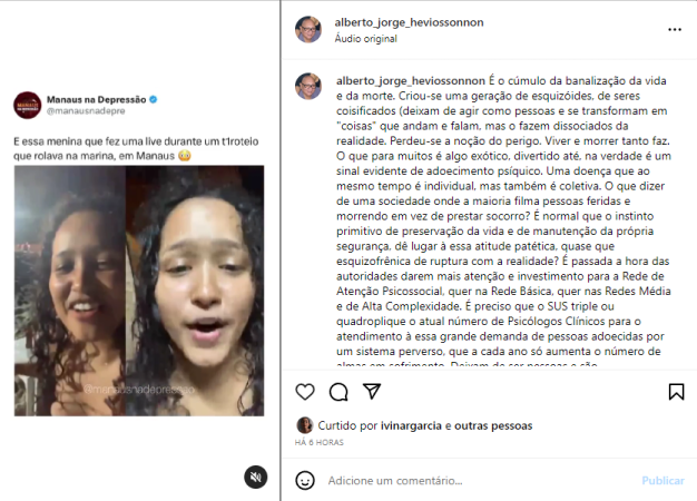 O sociólogo e professor da Universidade Federal do Amazonas (Ufam) Luiz Antônio Nascimento criticou a normalização de episódios violentos como o registrado nesta madrugada. Para ele, é preciso discutir que tipo de sociedade queremos construir e o que conseguimos com esse tipo de publicação.