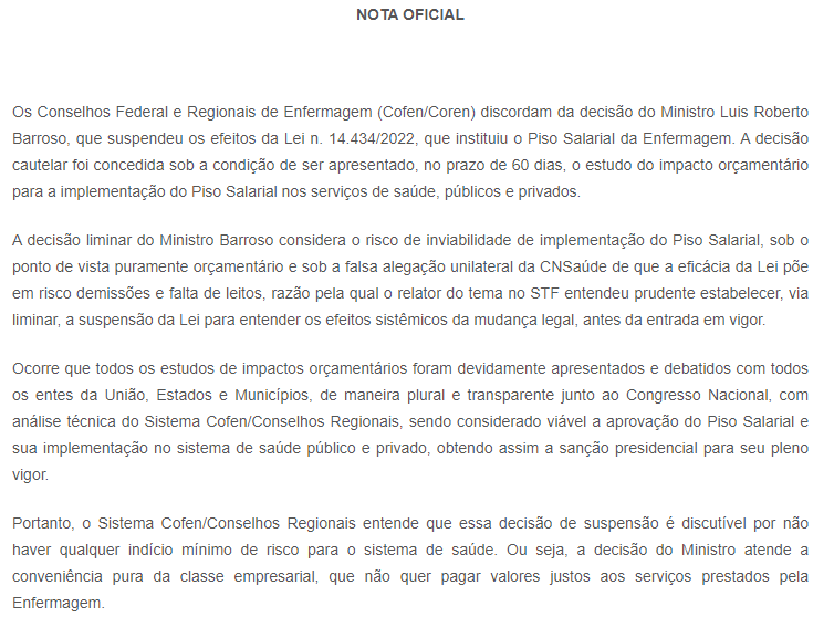 Em nota, os Conselhos Federal e Regional de Enfermagem (Cofen/Coren) discordam da decisão, que suspendeu os efeitos da Lei N° 14.434/2022 que instituiu o Piso Salarial da Enfermagem. Conforme comunicado, os conselhos afirmam que medidas serão tomadas para vetar a decisão do STF.