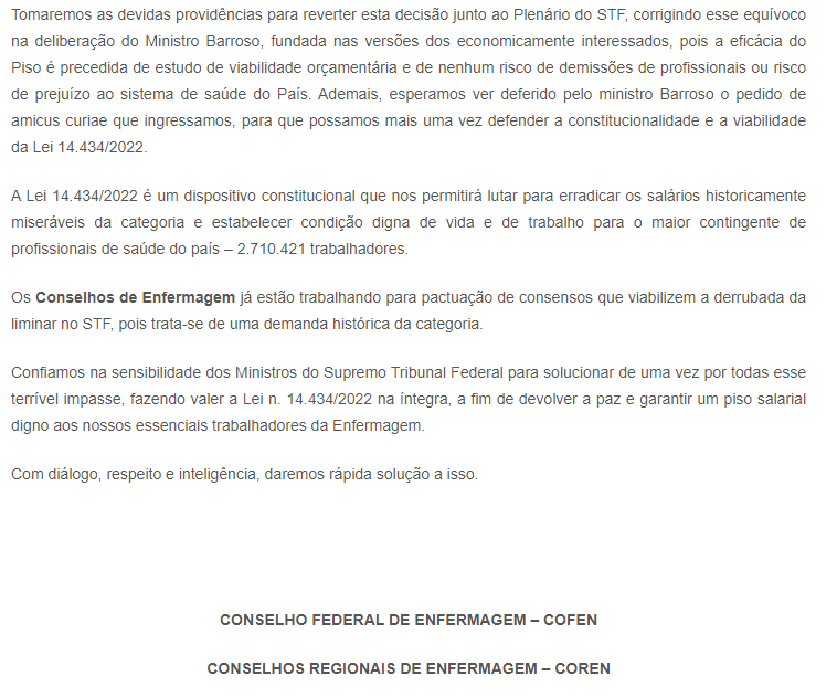 Confiamos na sensibilidade dos ministros do Supremo Tribunal Federal para solucionar de uma vez por todas esse terrível impasse, fazendo valer a Lei N° 14.434/2022 na íntegra, a fim de devolver a paz e garantir um piso salarial digno aos nossos essenciais trabalhadores da Enfermagem.