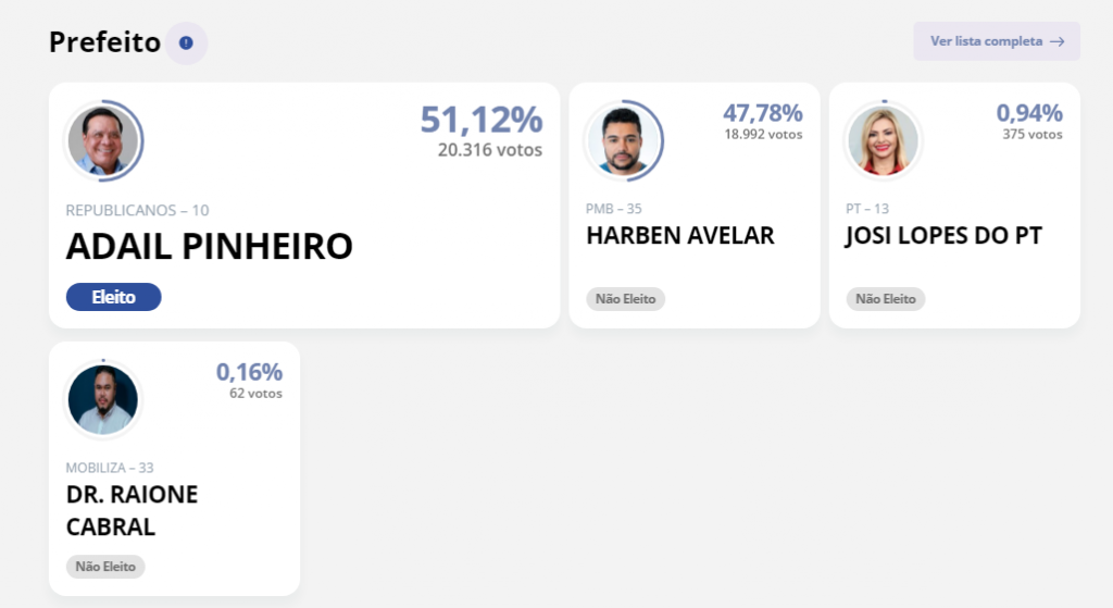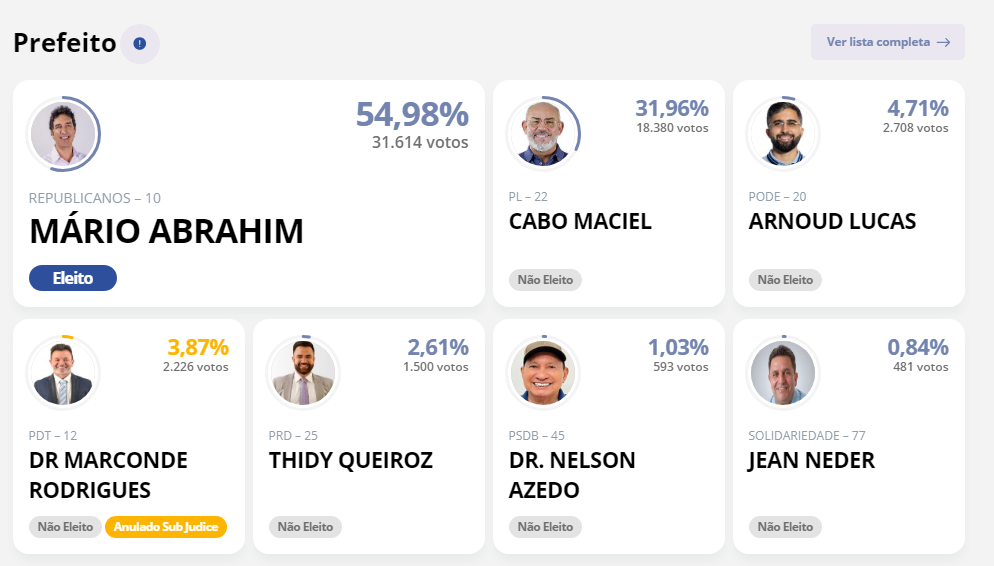 O grupo de Wilson Lima conquistou colégios eleitorais significantes no interior. Em Itacoatiara, o prefeito Mário Abrahim (Republicanos) foi reeleito com 54,98% dos votos válidos.
