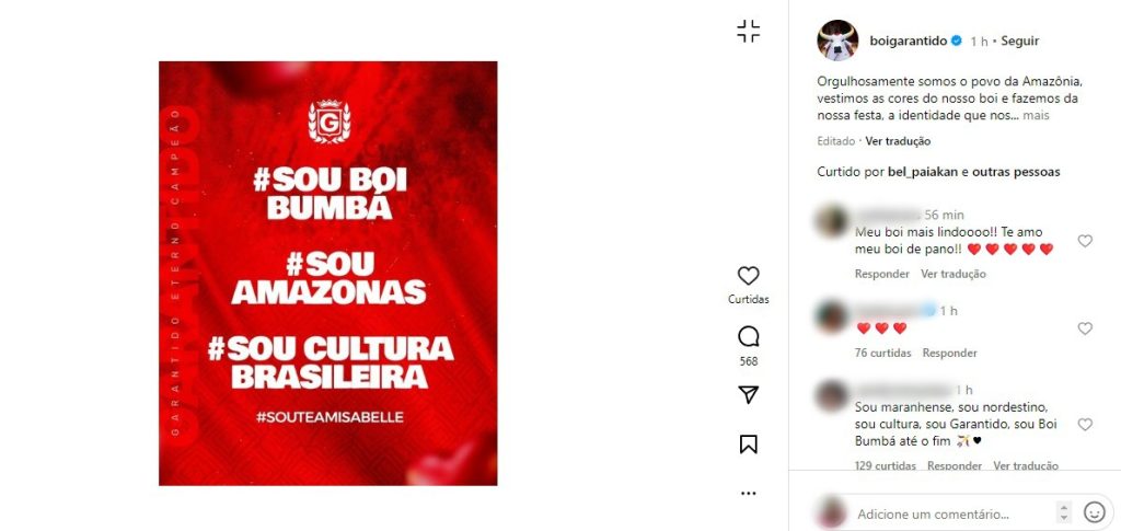 “Orgulhosamente somos o povo da Amazônia, vestimos as cores do nosso boi e fazemos da nossa festa, a identidade que nos projeta para o mundo. Somos um povo de muita história, de uma linda cultura, cheio de criatividade, de luta e de fé. Nós somos as mãos que fazem arte! Nós somos o Festival de Parintins!“, publicou.