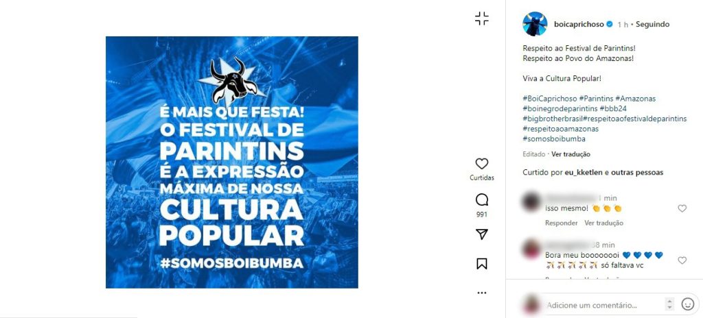 O artista ainda destacou que a cunhã-poranga do Boi Garantido, Isabelle Nogueira, que participa do BBB24, tem todo o direito de expressar sua cultura. “Isabelle, que está lá, é a cunhã-poranga do Boi Garantido. Portanto, ela tem que dançar boi-bumbá, a cultura dela. É como se estivesse uma sambista lá, e dançar o samba o tempo todo“, acrescentou.