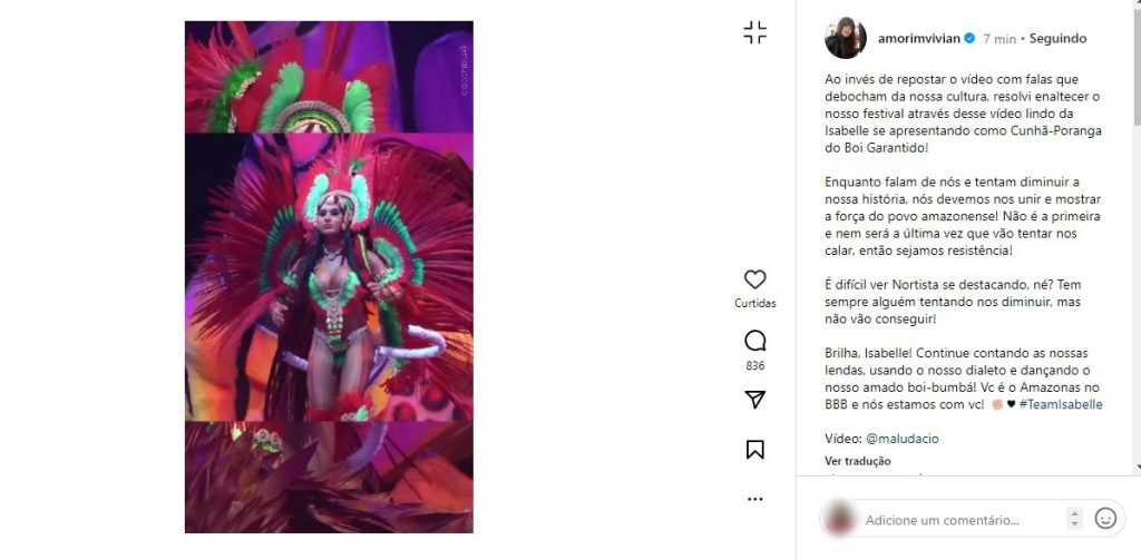 A ex-apresentadora e ex-participante do BBB 24 Vivian Amorim, que é amazonense, também se manifestou sobre as falas do cantor Rodriguinho. Ela compartilhou um vídeo de Isabelle Nogueira com as indumentárias da cunhã-poranga, em uma apresentação do Festival de Parintins.