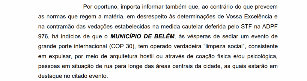 A ação aponta que o município e a União não efetivaram as disposições de uma decisão do Supremo Tribunal Federal (STF), além de não adotarem ações eficazes para reverter o aumento do número de pessoas em situação de rua em Belém.