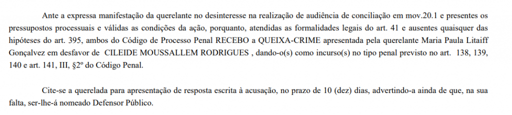 MANAUS (AM) – A blogueira e empresária Cileide Moussallem tornou-se ré no Tribunal de Justiça do Amazonas (TJAM) após o parecer favorável do Ministério Público (MP-AM) pelos crimes de calúnia, difamação e injúria, conforme previsto nos artigos 138, 139 e 140, combinados com o artigo 141, do Código Penal, contra a jornalista Paula Litaiff, diretora-geral da REDE CENARIUM. A blogueira tem 10 dias para apresentar defesa.