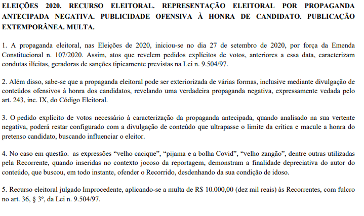 A decisão, assinada pelo juiz Jorge Manoel Lopes Lins, também determinou a remoção definitiva da publicação e reconheceu a competência da Justiça Eleitoral para julgar o caso. O Google do Brasil foi excluído da ação por ilegitimidade passiva, e o Ministério Público Eleitoral se manifestou pela manutenção da liminar concedida anteriormente. A multa foi aplicada com base no artigo 36, §3º, da Lei nº 9.504/97.