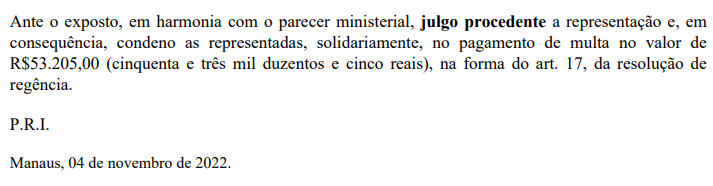 O caso seguiu em julgamento no TRE-AM. A Justiça entendeu que a divulgação da pesquisa precisava esperar cinco dias após o registro, o que não aconteceu. O tribunal também apontou que o registro da pesquisa não tinha todas as informações exigidas. Por isso, decidiu condenar o blog CM7, de propriedade de Cileide, ao pagamento de uma multa no valor de R$ 53.205,00.