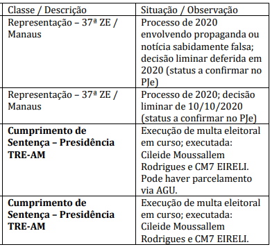 Os processos foram movimentados na 37ª Zona Eleitoral de Manaus e tiveram decisões liminares concedidas naquele ano. Outros dois procedimentos referem-se ao cumprimento de sentença envolvendo a execução de multas eleitorais, nos quais Cileide e o blog CM7 figuram como partes executadas. Uma das ações é relacionada à divulgação de pesquisa de intenção de voto antes do prazo permitido pela legislação.