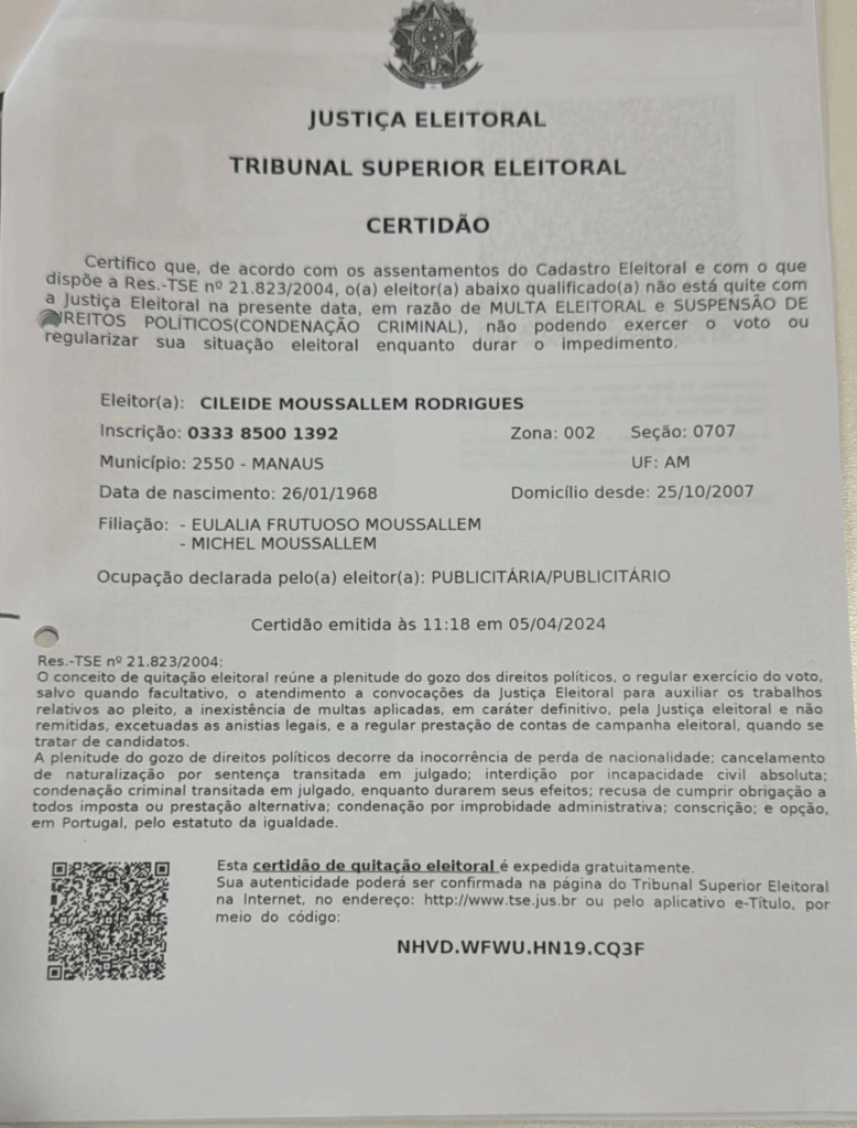 MANAUS (AM) – A blogueira Cileide Moussallem, proprietária do blog CM7, teve os direitos políticos suspensos após condenação criminal com trânsito em julgado e pagamento de multa em processos que tramitam na Justiça Eleitoral, conforme certidão emitida pelo Tribunal Superior Eleitoral (TSE). O documento, datado de 5 de abril de 2024, indica que Moussallem “não está quite com a Justiça Eleitoral”. Ela assinou acordos para pagamento de multa, parcelado em até 60 vezes, o que, segundo a Constituição Federal, implica na suspensão dos direitos políticos enquanto durarem os efeitos da sentença. Veja documento:
