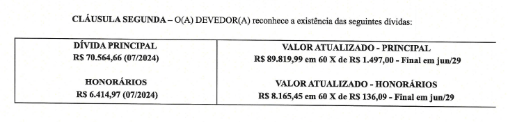 Cileide firmou um acordo, em julho de 2024, para o pagamento da multa que chegou a R$ 97 mil. O valor será quitado em 60 parcelas mensais, sendo R$ 1.497,00 relativas à dívida principal e R$ 136,09 referentes aos honorários advocatícios, com vencimento no último dia útil de cada mês. A blogueira pagará o valor até junho de 2029. O acordo prevê a emissão de Guias de Recolhimento da União (GRU) pelo site oficial do Tesouro Nacional, conforme instruções normativas da Advocacia-Geral da União (AGU). Veja trecho de documento: