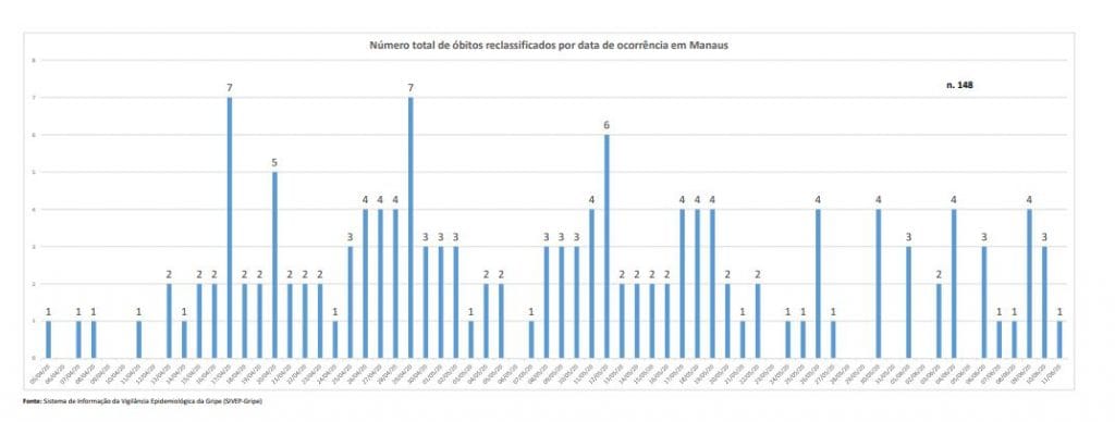 Por meio do gráfico, é possível verificar a reclassificação por data de ocorrência dos óbitos que atendem aos critérios de Síndrome Respiratória Aguda Grave (Srag-não especificado), realizado pela Secretaria Municipal de Saúde de Manaus.