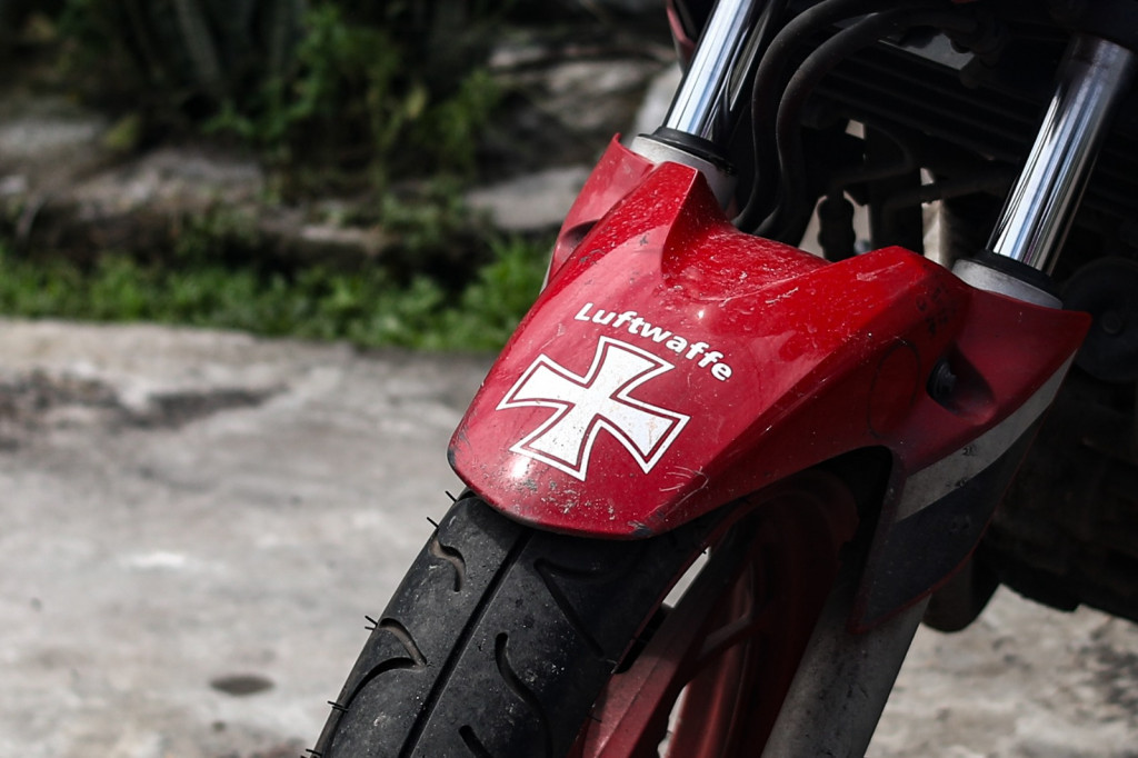 A reportagem conseguiu localizar o veículo do investigado no município de Ananindeua, na Região Metropolitana de Belém (RMB). No paralama dianteiro da motocicleta, uma Honda CB250F Twister, há um adesivo com a inscrição Luftwaffe e outro com a Cruz de Ferro, referências ao nazismo. O veículo também apresentava marcas e resíduos na lataria, sugerindo que outros adesivos foram removidos recentemente.
