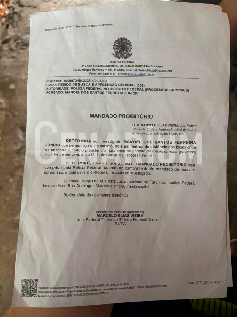 No dia 12 de fevereiro, a PF cumpriu mandado de busca e apreensão contra Manoel Júnior, autorizado pela Justiça Federal, que também determinou medidas cautelares, como o uso de tornozeleira eletrônica e a proibição de se aproximar de locais onde Lula esteja presente. A decisão foi tomada em meio à visita do presidente ao Pará na última semana, onde ele participou da entrega de moradias do programa Minha Casa, Minha Vida e vistoriou as obras para a Conferência das Nações Unidas sobre as Mudanças Climáticas de 2025 (COP30).