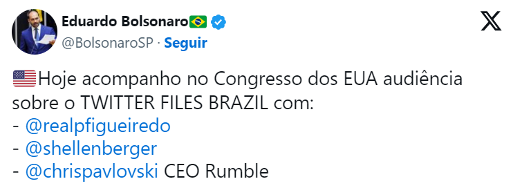 Crítico do andamento das ações humanitárias do Rio Grande do Sul, o deputado Eduardo Bolsonaro está fora do Brasil para uma audiência no Congresso dos Estados Unidos a respeito da série de reportagens ‘Twitter Files Brazil’. As produções relatam sobre as decisões do ministro do Supremo Tribunal Federal (STF) Alexandre de Moraes no que se refere à suspensão de contas na redes sociais X por disseminação de notícias falsas.