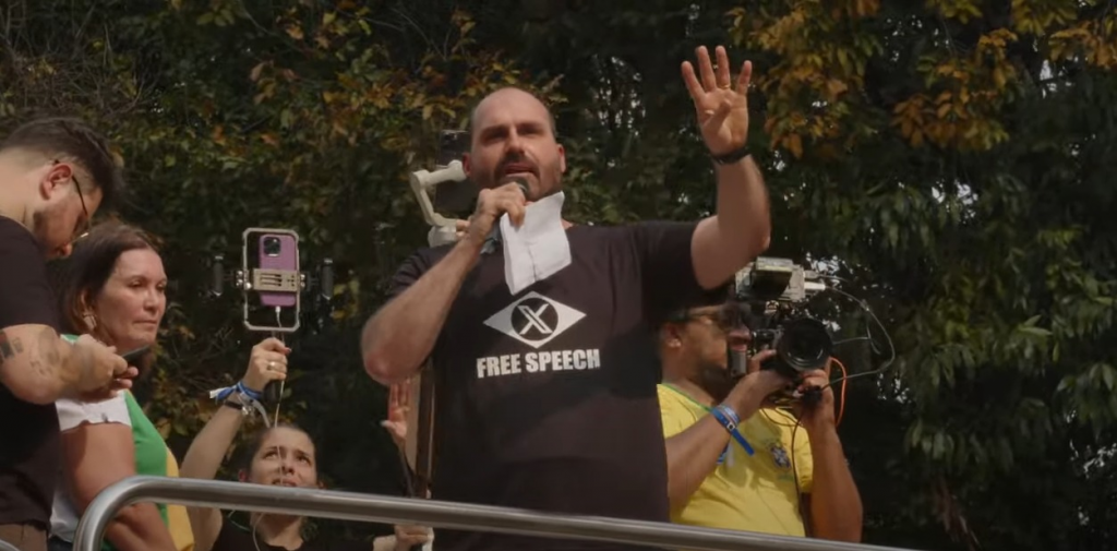 No Dia da Independência do Brasil, nesse sábado, 7, conservadores se reuniram na Avenida Paulista, na capital de São Paulo, para atacar Moraes e defender ideias contra o Supremo. Flávio Bolsonaro, ainda ativo no X, subiu em um trio elétrico junto de personalidades de direita, como o pastor Silas Malafaia, com uma camisa da bandeira do Brasil, substituindo os ditos “Ordem e Progresso” pelo logotipo do X. Durante o discurso, o filho do ex-presidente pediu anistia para todos os presos do dia 8 de janeiro e o impeachment do ministro do STF.