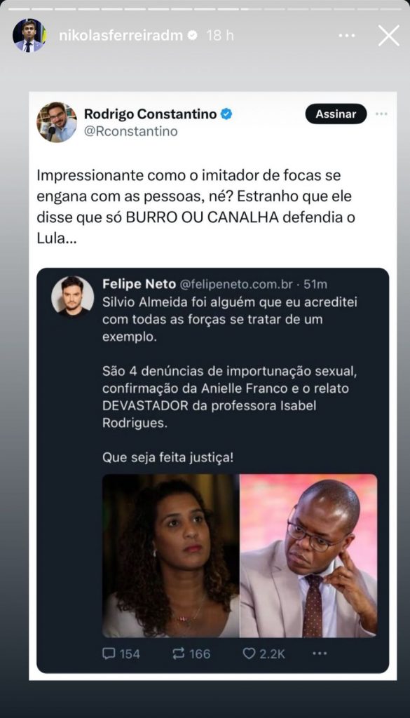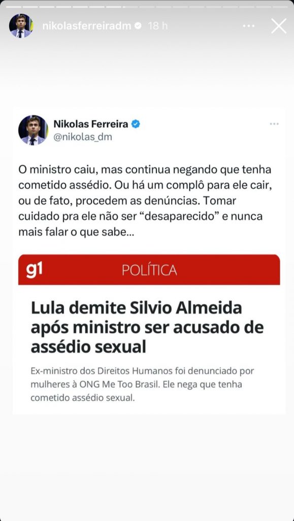 Um dos usuários que se mantém ativo é o deputado federal Nikolas Ferreira (PL), que organizou manifestações contra o ministro do STF nesse sábado, 7, Dia da Independência do Brasil. O parlamentar também acusa o presidente da República, Luiz Inácio Lula da Silva (PT), de demitir o ministro do Direitos Humanos para ocultar planos de governo. “Tomar cuidado para ele não ser ‘desaparecido’ e nunca mais falar o que sabe”, acusa o deputado por meio da rede social bloqueada.