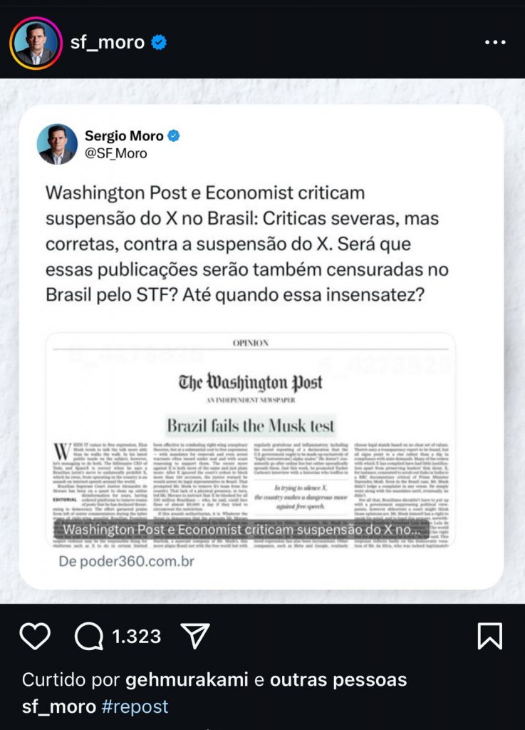 O ex-ministro da Justiça e senador pelo Estado do Paraná Sérgio Moro também contraria Alexandre de Morais se mantendo ativo na rede e publicando abertamente em outras plataformas que se manterá como usuário do X. O ex-ministro acusa o STF de censura ao compartilhar uma notícia do jornal americano Washington Post sobre o embate entre o milionário Elon Musk e Alexandre de Moraes: “Será que essas publicações serão também censuradas no Brasil pelo STF?”, questiona Moro.