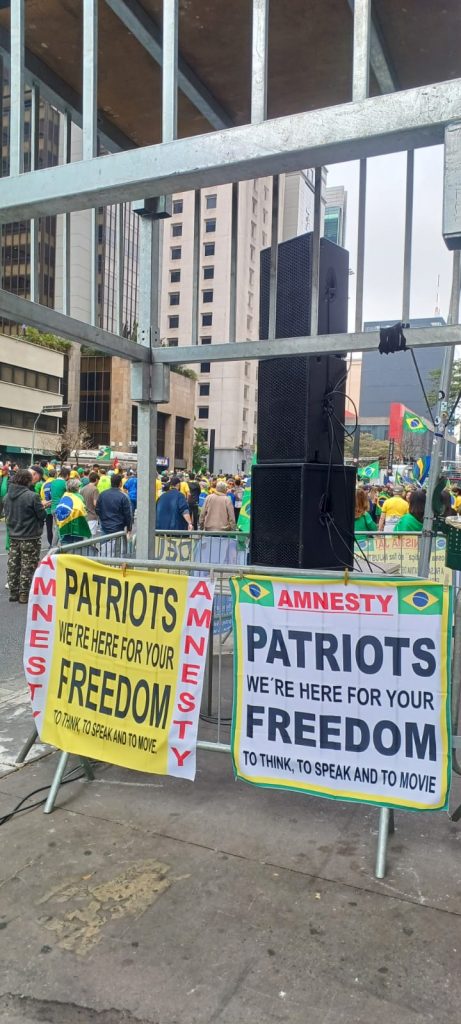 Nas grades próximas ao palanque, por exemplo, centenas de pessoas mostram um cartaz com o dizer “SOS Trump, Bolsonaro Free”. Também são avistadas placas com a imagem de Carla Zambelli, que está presa na Itália.